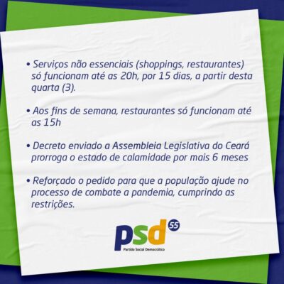 O governador do estado do Ceará, Camilo Santana, anunciou essa semana novas medidas para o combate contra a pandemia. Elas estarão entrando em vigor a partir de hoje (03). Acompanhe a publicação para conhecer as principais novas medidas!