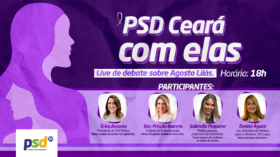Com o tema PSD Ceará com elas, o partido abre uma roda de debates que estreia com a campanha Agosto Lilás, mês de enfrentamento à violência doméstica e familiar, e que busca sensibilizar e conscientizar a sociedade sobre o fim da violência contra a mulher, ampliar a rede de serviços especializados no atendimento à mulher, em situação de violência, e promover mecanismos de denúncia e apoio às vítimas em todo o país.
